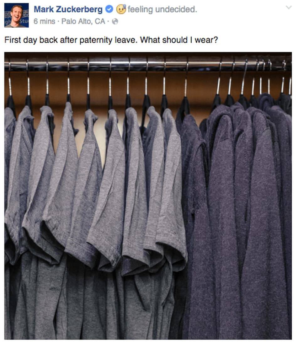 Er sagt zurecht, dass er nicht bereits morgens kognitive Energie damit verschwenden möchte, darĂŒber nachzudenken, was er heute anzieht. Dementsprechend sieht sein Kleiderschrank so aus: